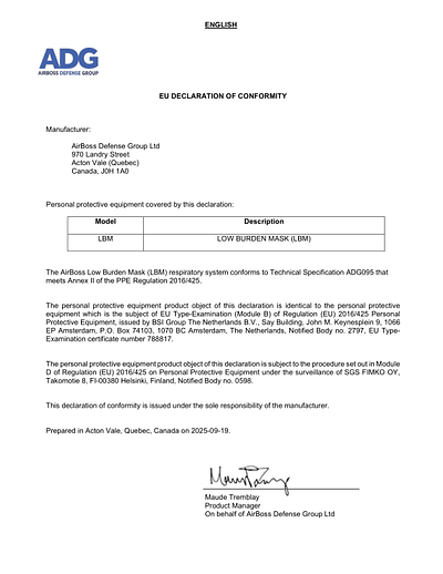 The AirBoss Low Burden Mask (LBM) respiratory system conforms to Technical Specification ADG095 that meets Annex II of the PPE Regulation 2016/425.